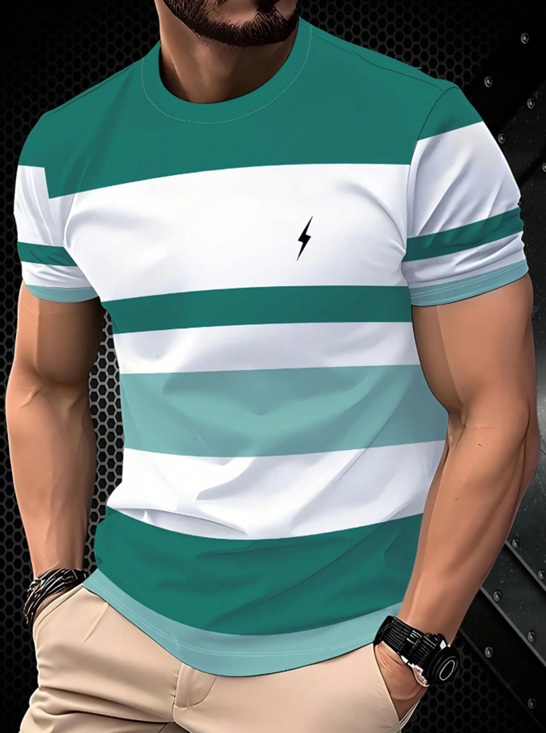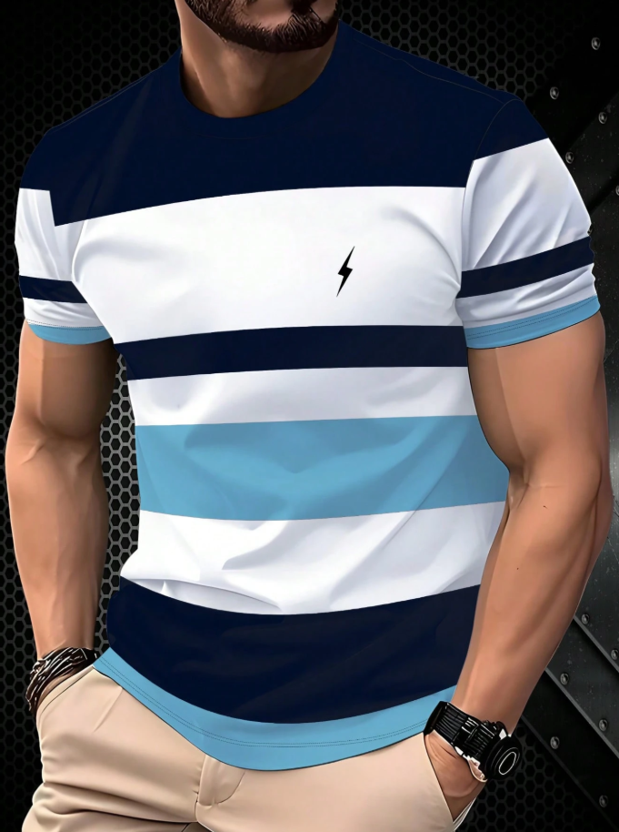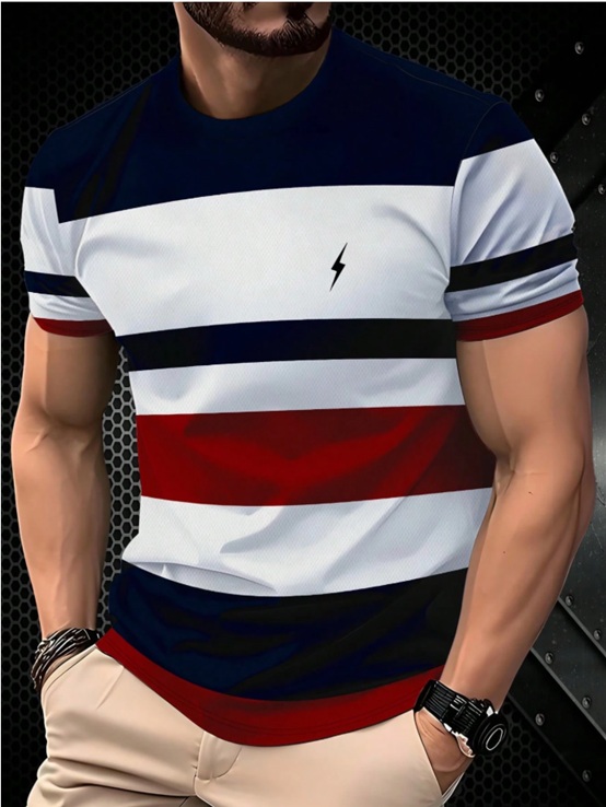 Men’s Casual Round Neck 3D Striped Print T-Shirt, Breathable And Comfortable, Machine Washable. 100%